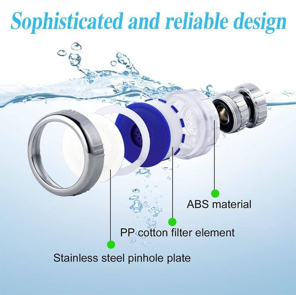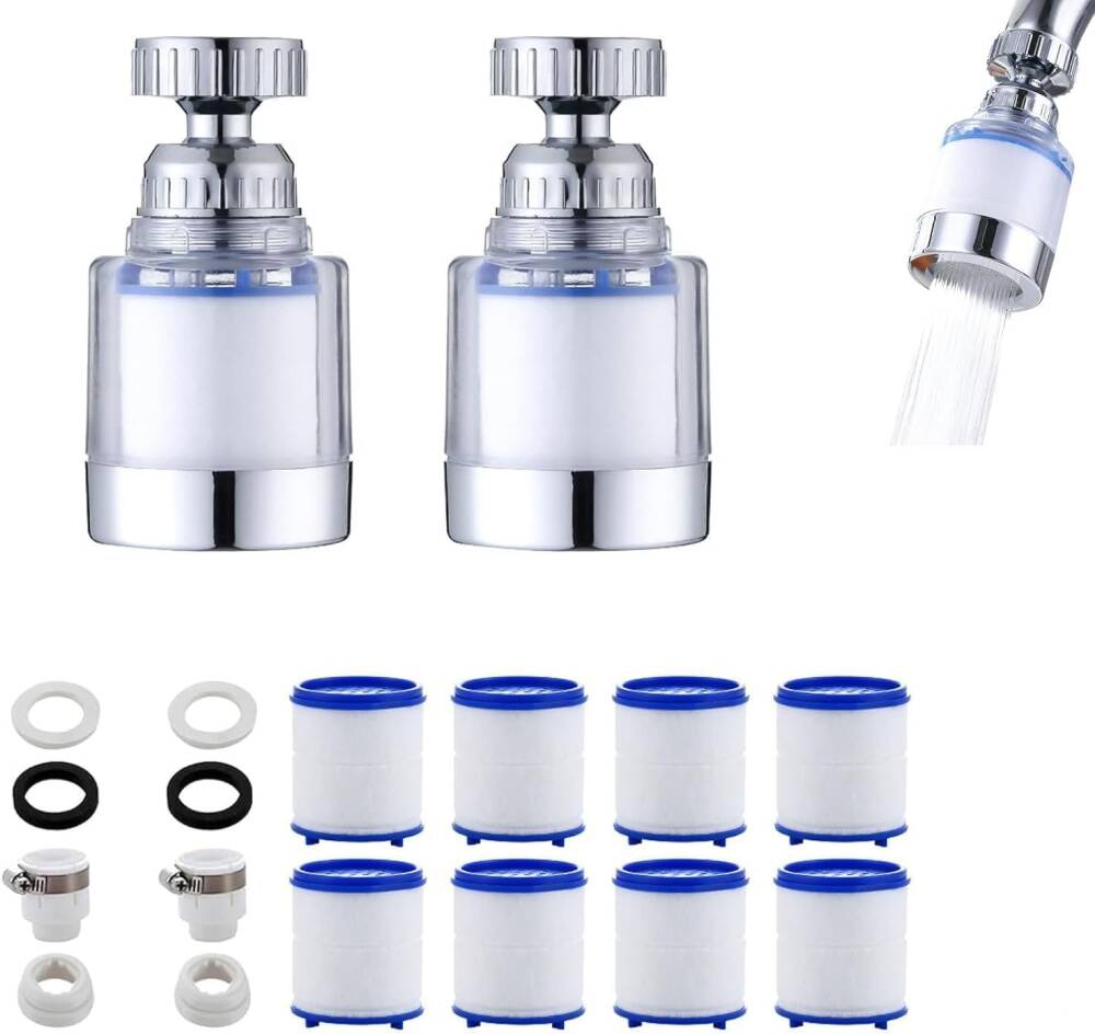 Musluk başlıkları her yöne dönebilir. Bulaşık, lavabo ve tezgah temizliğinde konforlu kullanım sağlar. Her musluk başlığı için 4’er adet olmak üzere toplam 8 filtre yedeği ile birlikte gelir. Su akışını temizler, kireç oluşumunu azaltır. Düşük su basıncında bile güçlü akış sunar. Yıkama gücü yüksek, su tüketimi düşüktür. Hem ekonomik hem çevreci. Standart musluklarla uyumlu tasarımı sayesinde evinizdeki çoğu musluğa kolayca takılır. Adaptör ve kurulum parçaları dahil.