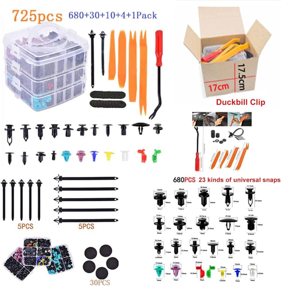 Toplam 725 parçadan oluşan bu set, 38 farklı boyutta evrensel araç klipslerini, 30 adet titreşim önleyici sünger yastığı ve 1 adet metal sökme aletini içerir. Tam kapsamlı tamir ve bakım çözümüdür. Klipsler, uzun ömürlü naylon plastikten üretilmiştir. Esnek ama sağlam yapıları sayesinde kolayca kırılmaz. Metal sökme aparatı sayesinde hassas alanlarda zarar vermeden işlem yapılabilir. 3 bölmeli dayanıklı plastik kutu içerisinde gelir. Araçta kolayca saklanabilir ve istenilen yere taşınabilir. Her şey elinizin altında, organize bir şekilde.